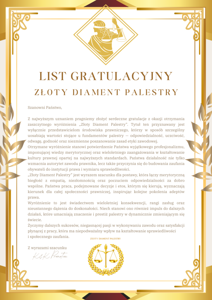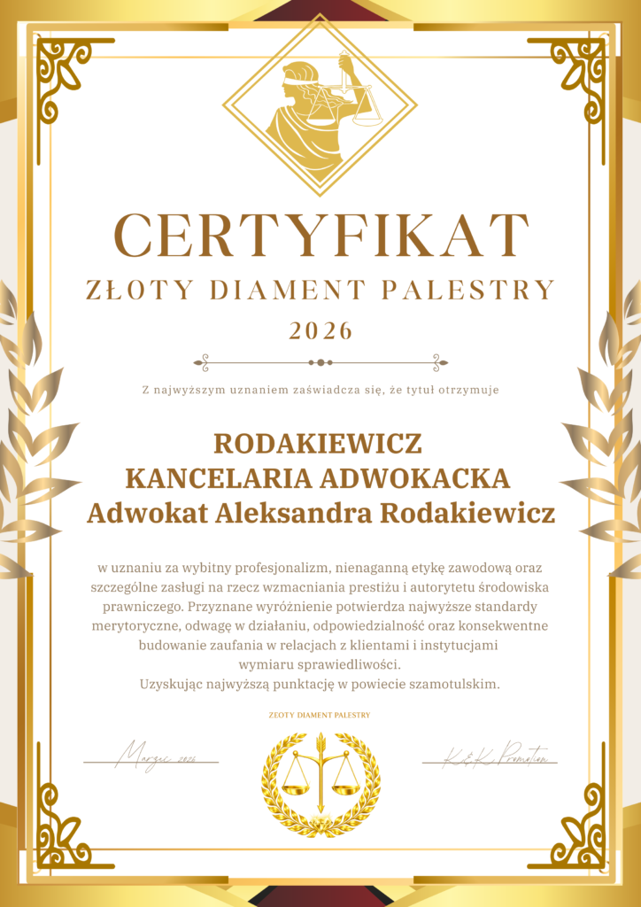 Z dumą informujemy, że Kancelaria Adwokacka Adwokat Aleksandra Rodakiewicz została wyróżniona tytułem Złoty Diament Palestry 2026. To prestiżowe wyróżnienie stanowi potwierdzenie najwyższych standardów merytorycznych, etycznych oraz profesjonalnego zaangażowania w świadczenie pomocy prawnej. Nagroda jest dla nas nie tylko zaszczytem, ale również motywacją do dalszej pracy na rzecz naszych Klientów z pełnym zaangażowaniem, rzetelnością i odpowiedzialnością.